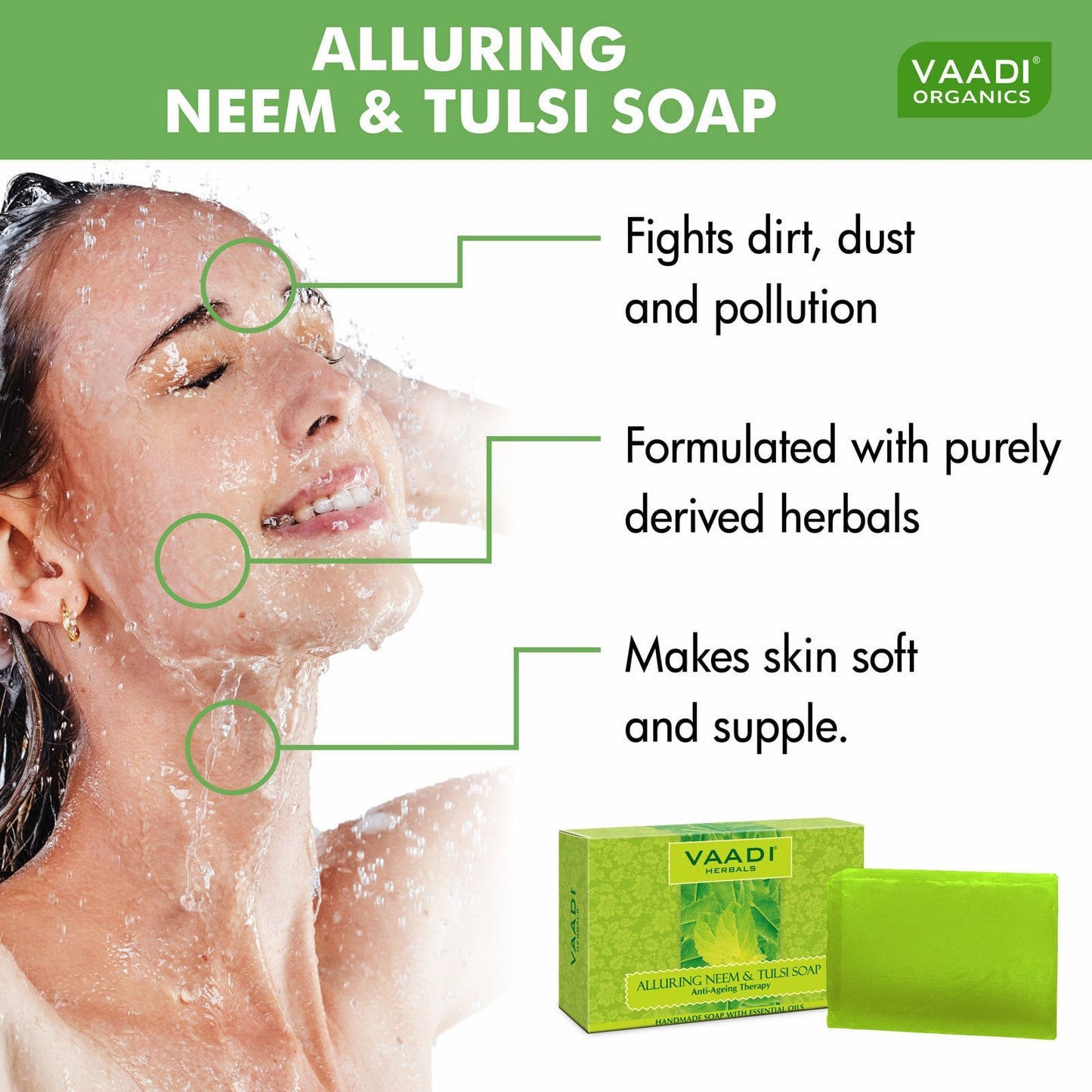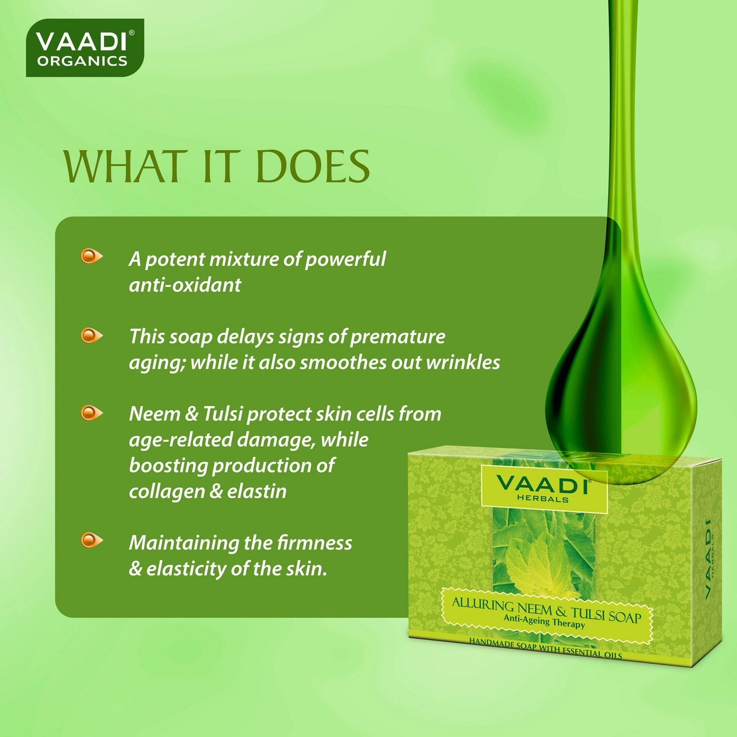 مزيج قوي من مضادات الأكسدة القوية، هذا الصابون يؤخر علامات الشيخوخة قبل النضج؛ بينما يخفف أيضا التجاعيد. يحمي زيت نيم وتلسي خلايا البشرة من الأضرار المرتبطة بالعمر، بينما يعزز إنتاج الكولاجين والكلاستين؛ فيحافظ على صلابة البشرة وليونتها.