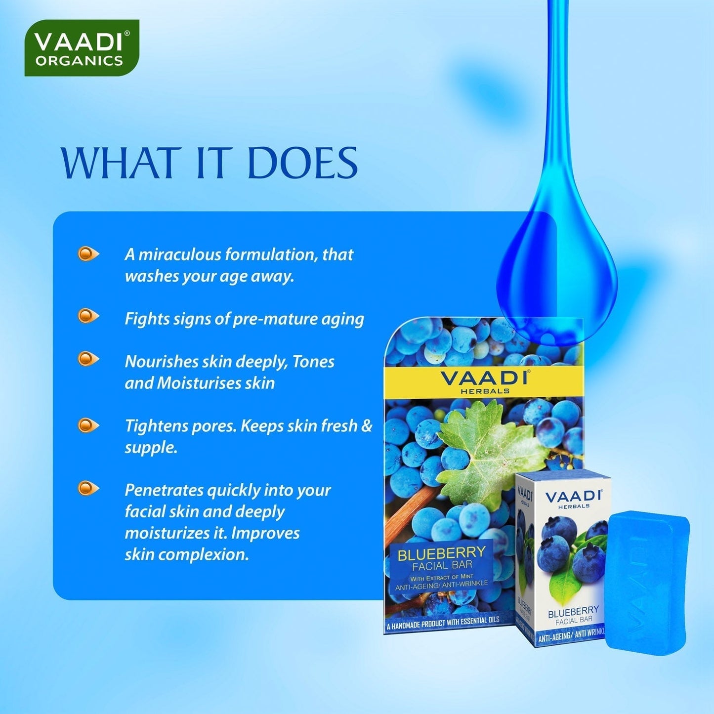 Ingredients : Aloe Vera Extract, Honey, Tea Tree Oil, Blueberry Extract, Mint Extract,Orange Peel, Saffron Extract, Sandal Oil, Apple Extract, Cane Sugar, Olive Extract, Papaya Extract, Almond Oil, Grape Seed Extract,