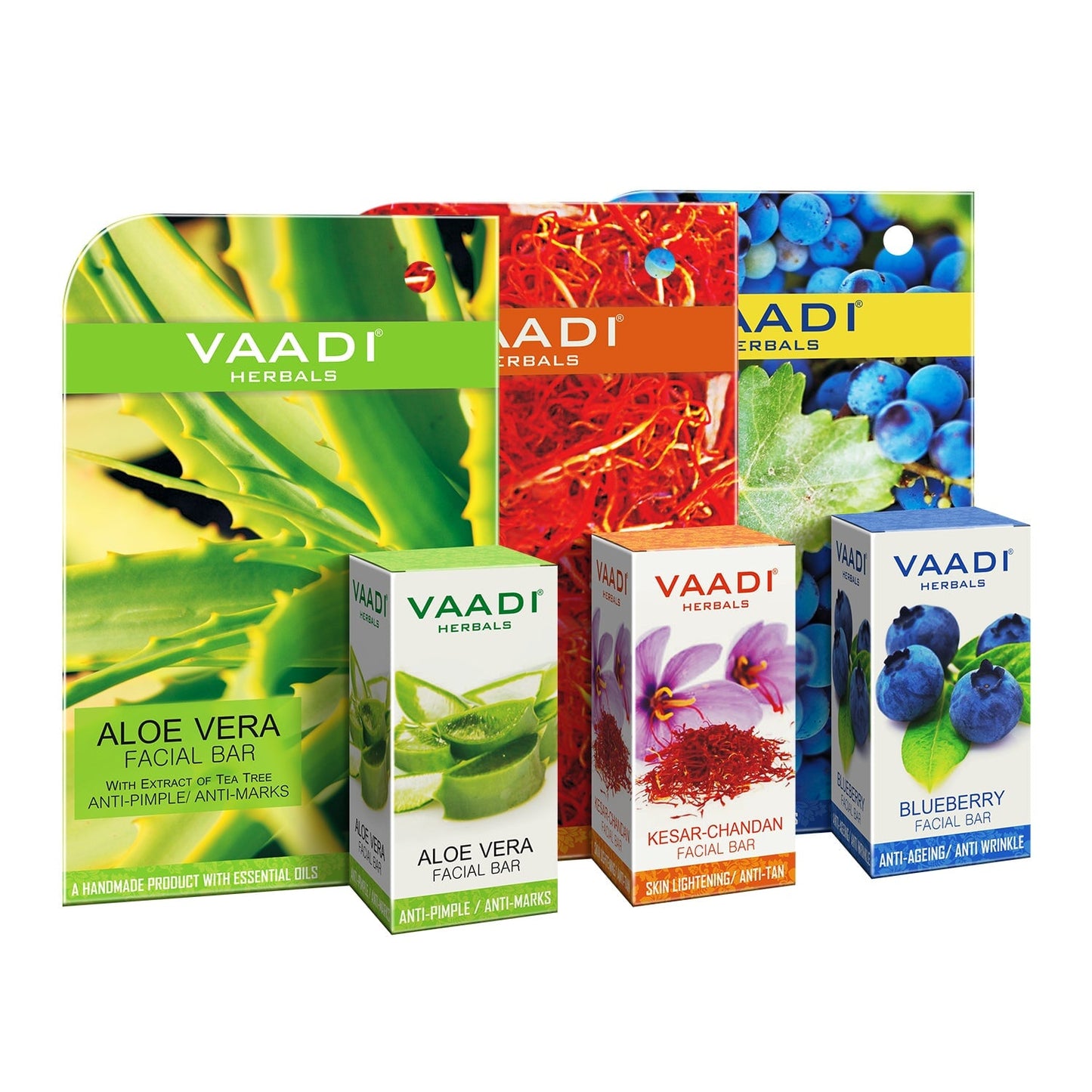 This assortment of facial bars brings together the goodness of extracts of Aloe Vera, Saffron, and Fruits. These facial bars have excellent deep cleansing properties and gently exfoliate to even out skin tone. The rich multivitamin content of Strawberry, Almonds and Grape seed helps fight pigmentation and signs of premature aging, to reveal younger and healthier skin with regular use.