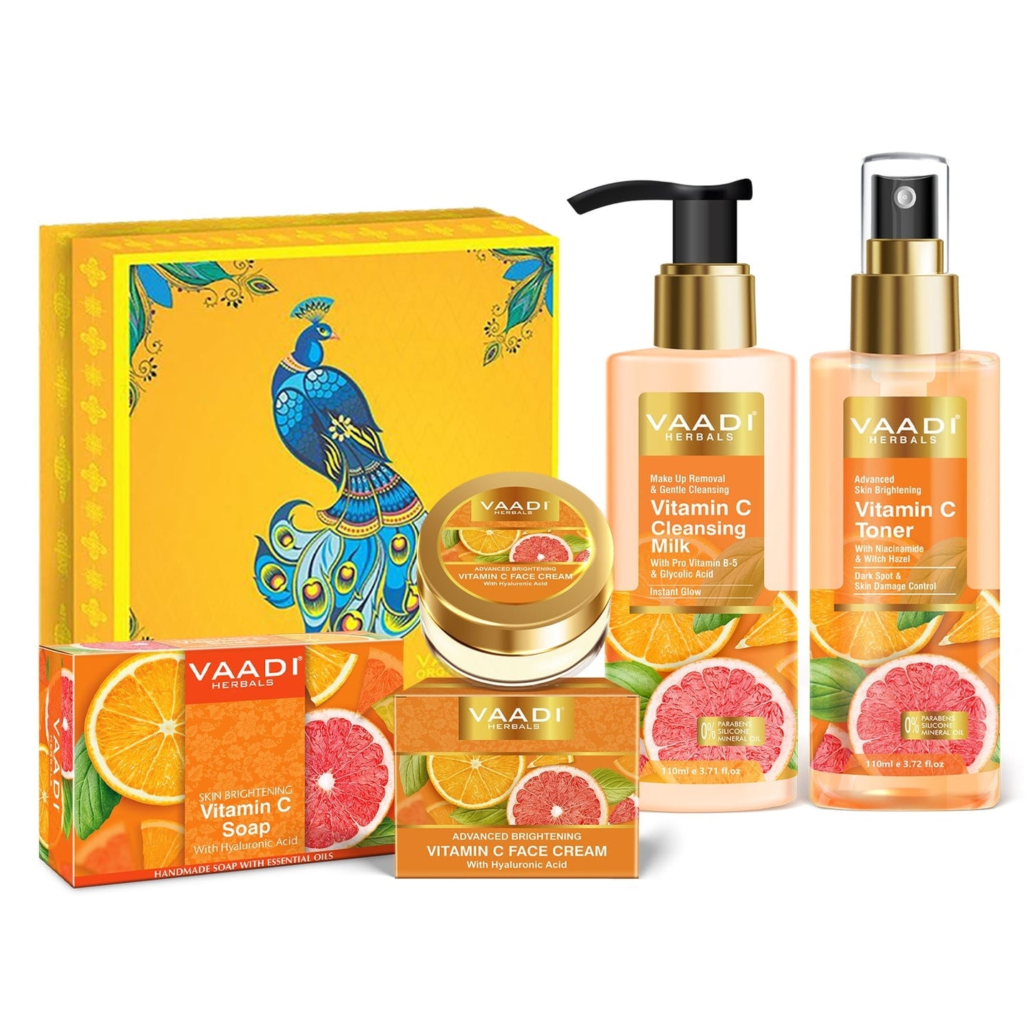 Ingredients : Steam Distilled Orange Peel Extract, Active Vitamin C (MAP- Magnesium Ascorbyl Phosphate), Plant Derived D Panthenol, Honey Extract ,Lemon Peel Extract, Coconut Oil Derivative, Glycolic Acid (From Sugarcane), Pure Rose Water (Rosa Centifolia),), Saffron, Gold Bhasma, Sweet Almond Oil, Jojoba Oil, Organic Honey,Witch Hazel (Hamamelis virginiana),Fruit Extract, Citric Acid, Hyaluronic Acid, Tocopherol Acetate (Vitamin E), D-Panthenol (Vitamin B5), Lactic Acid, Licorice Root Extract, Sodium PCA, Cellulose Gum Derived from Cotton, Vegan complaint Xanthun Gum, Potassium Sorbate, Aqua Jasmine Oil (Jasminum Officinale Lemon Extract, Watermelon Extract (Citrullus Lanatus), Vitamin-E (Tocopheryl Acetate), Carrot Seed, Mulberry and Turmeric Aqua..