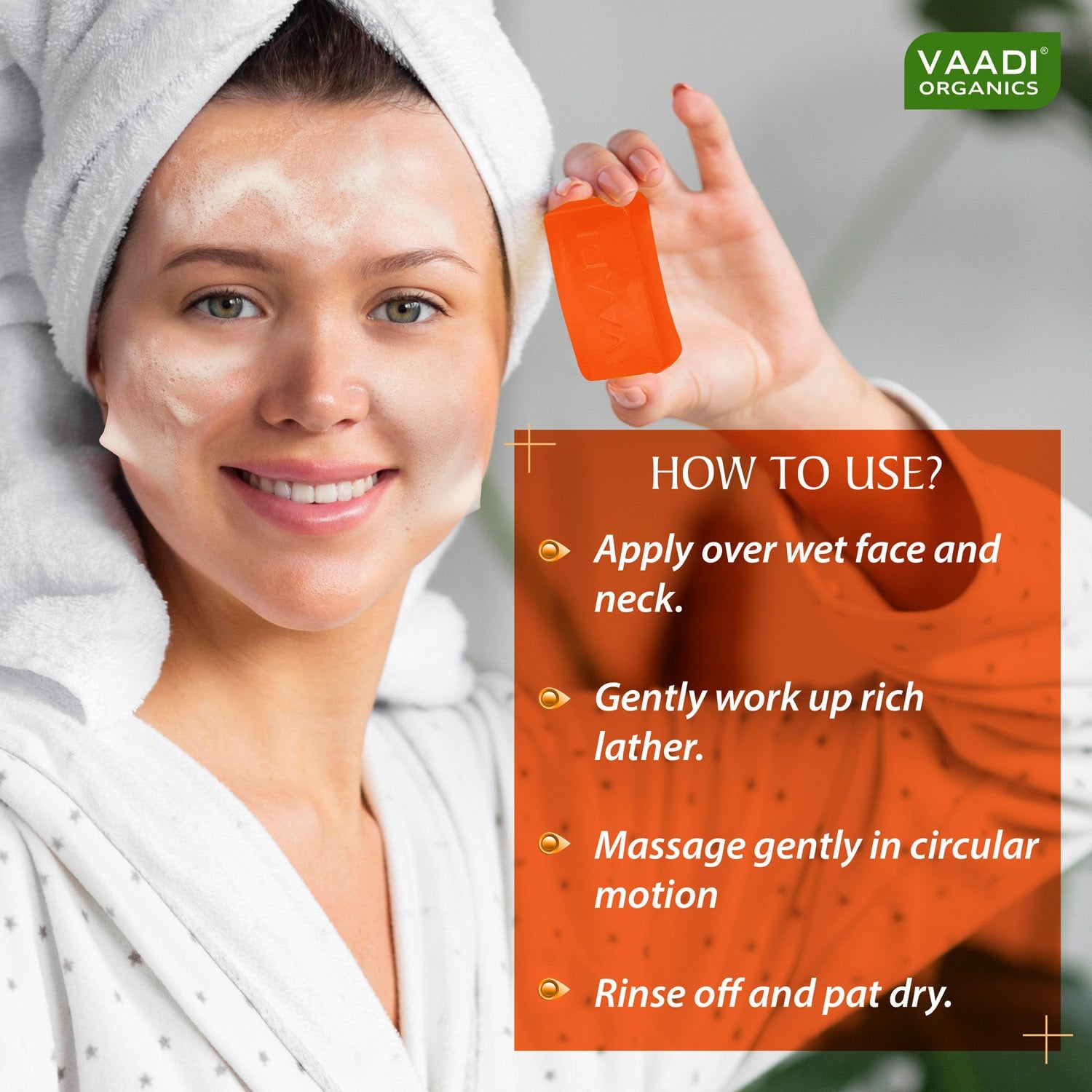 صابون الزعفران للوجه والرقبة - يُضاف على الوجه والرقبة المبللان، ودلكي للحصول على الرغوة بحركة دائرية بلطف. يشطف ويجفف.