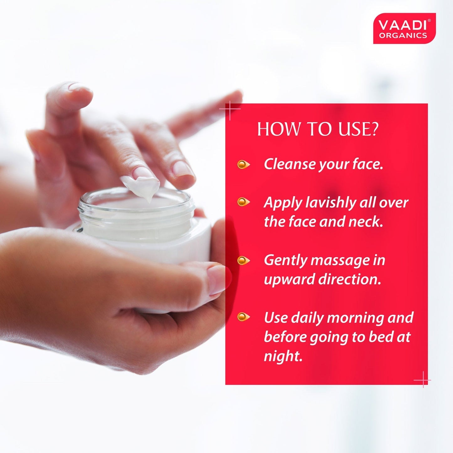 ينظف الوجه. ضعيه بشكل رائع على الوجه والرقبة. دلكي بلطف في الاتجاه التصاعدي. يستخدم صباح اليوم وقبل النوم في الليل. تجنبي التعرض لأشعة الشمس بعد استخدام الكريم لفترة طويلة أو تأكد من استخدام SPF قبل أن تذهب إلى الشمس