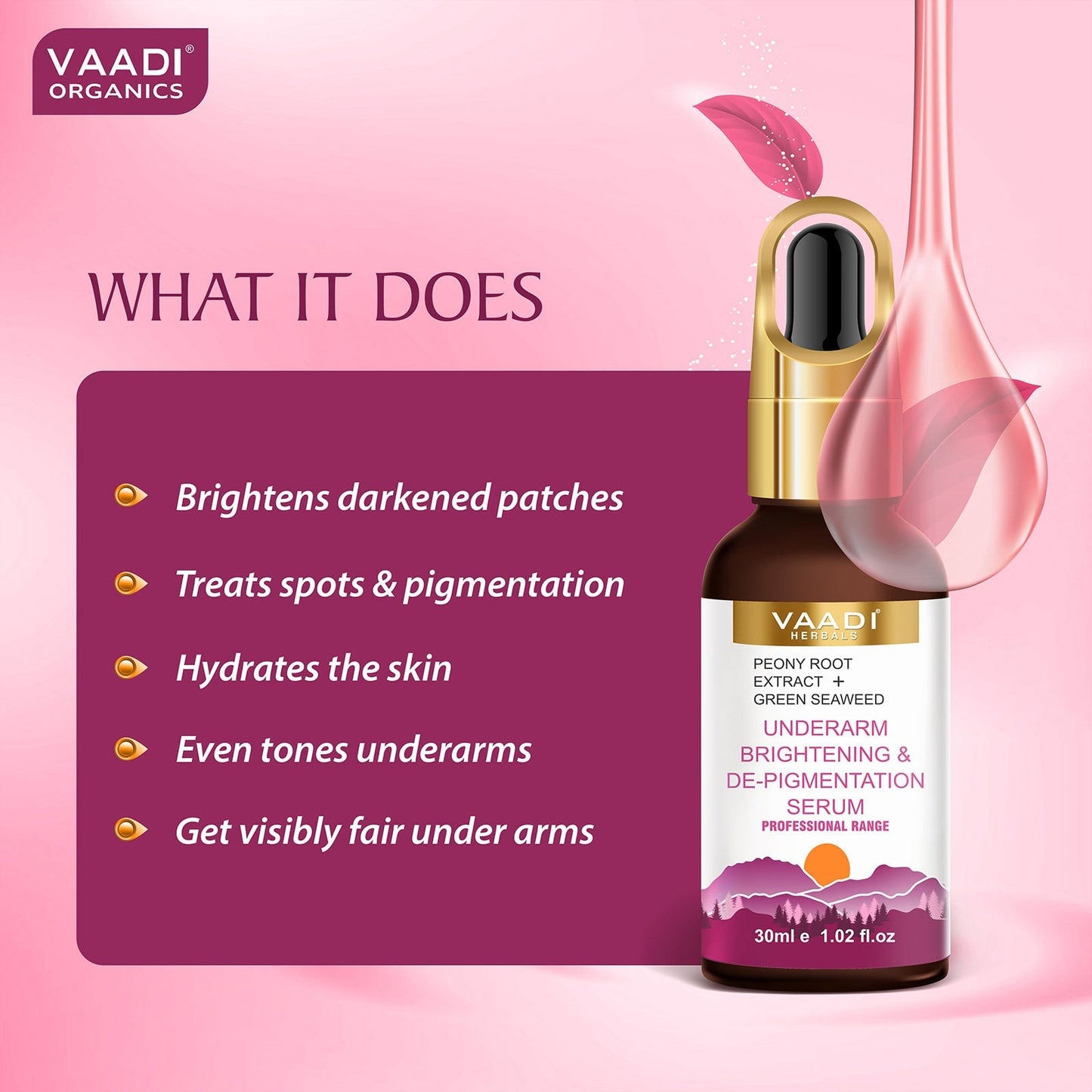Vaadi Herbals Underarm Brightening serum works effectively to lighten dark patches and discoloration in the underarm skin and reduces pigmentation and roughness due to excessive dryness. The serum is non-sticky and discourages melanin production that results in smooth, even toned underarms when used regularly in just 4 weeks.