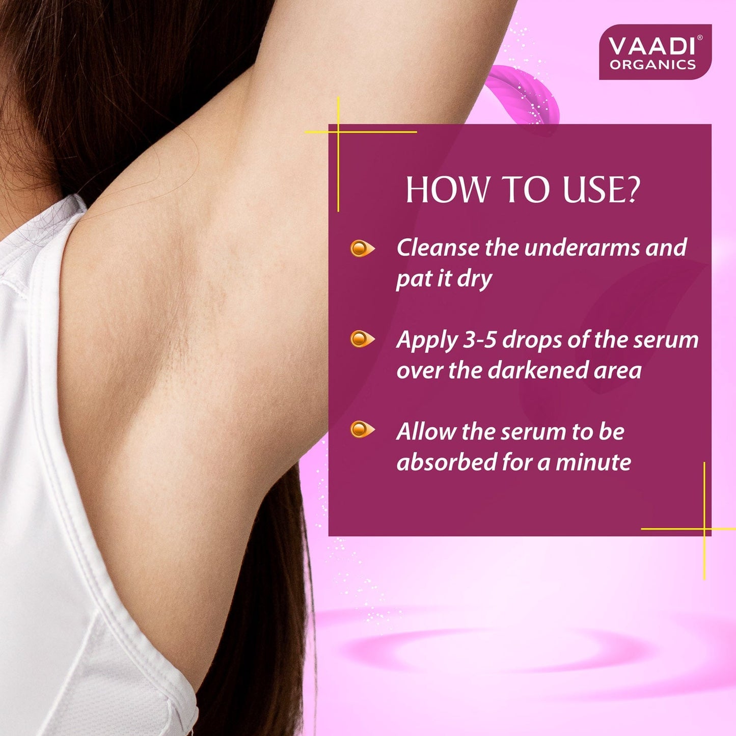 Cleanse the underarms and pat it dry. Apply 3-5 drops of the serum over the darkened area. Allow the serum to be absorbed for a minute.