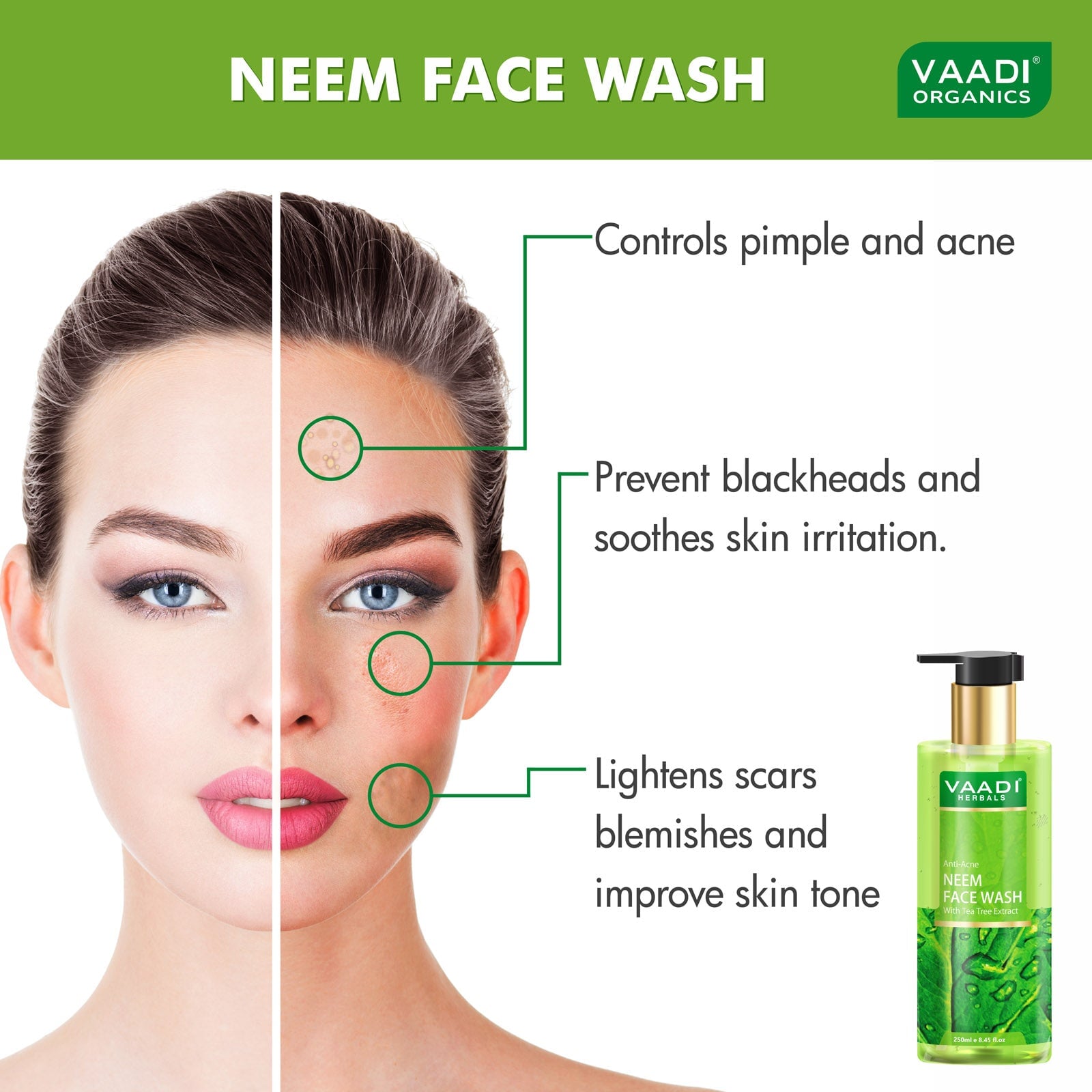 This double-action formulation controls acne by regulating sebum (oil) production, and killing the acne-causing bacteria. Neem’s anti-bacterial and astringent actions also unclog pores and prevent recurrence of acne. Anti-oxidant Tea Tree Extract helps acne lesions heal faster and soothes skin, whilst its antimicrobial activity controls infection.
