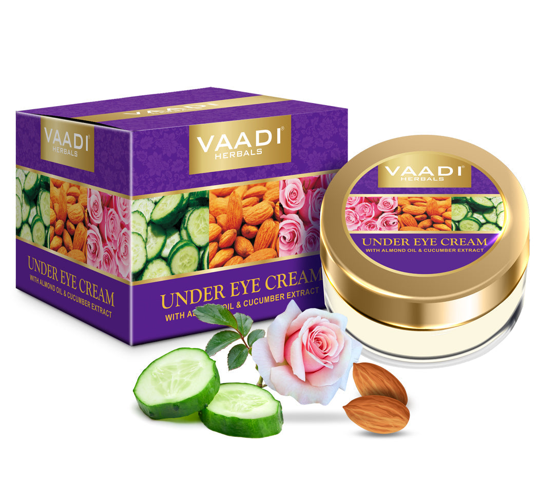 A super-rich formula for your under-eye skin; its regular use keeps your eyes and the surrounding skin looking young & lively. The age-old goodness of Cucumber, Almonds & Pink Rose, works from within to lighten the dark skin (circles) under the eyes, and to reduce puffiness. Their anti-oxidant content smoothes wrinkles, reducing years off your eyes!